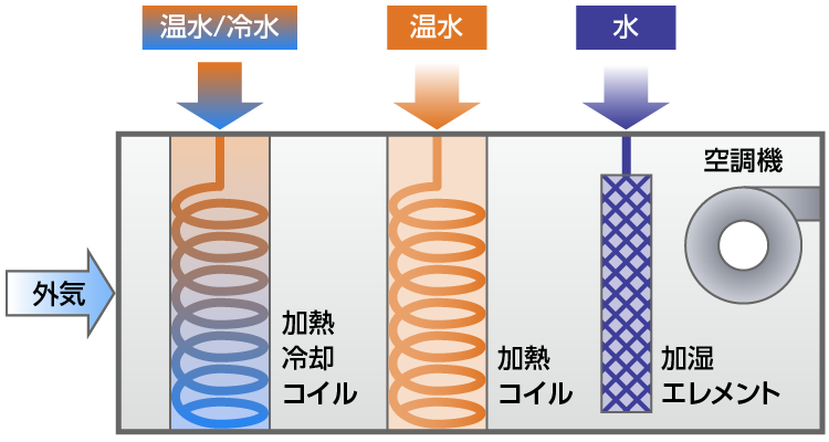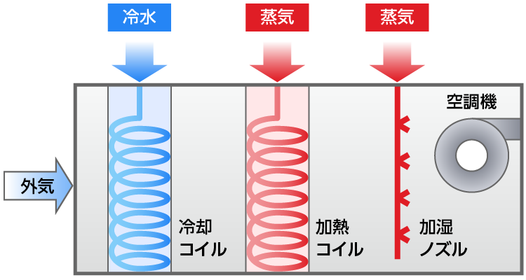 高効率ヒートポンプと気化式加湿器の組み合わせで、加熱・加湿のための蒸気を不要とし、スチームレス化によるエネルギー削減に貢献