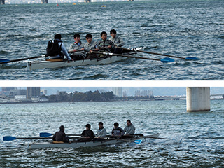 また、コミュニケーションとチームワークの醸成、座学からの気分転換を目的に昨年度よりカリキュラムに取り入れたボート体験学習では、ボート経験者の指導のもとに漕艇の練習を行った後、琵琶湖漕艇場から瀬田唐橋間、約2kmを往復しました。参加者からは「こんなにしんどいと思わなかった」との声も聞かれましたが、充実した体験となりました。